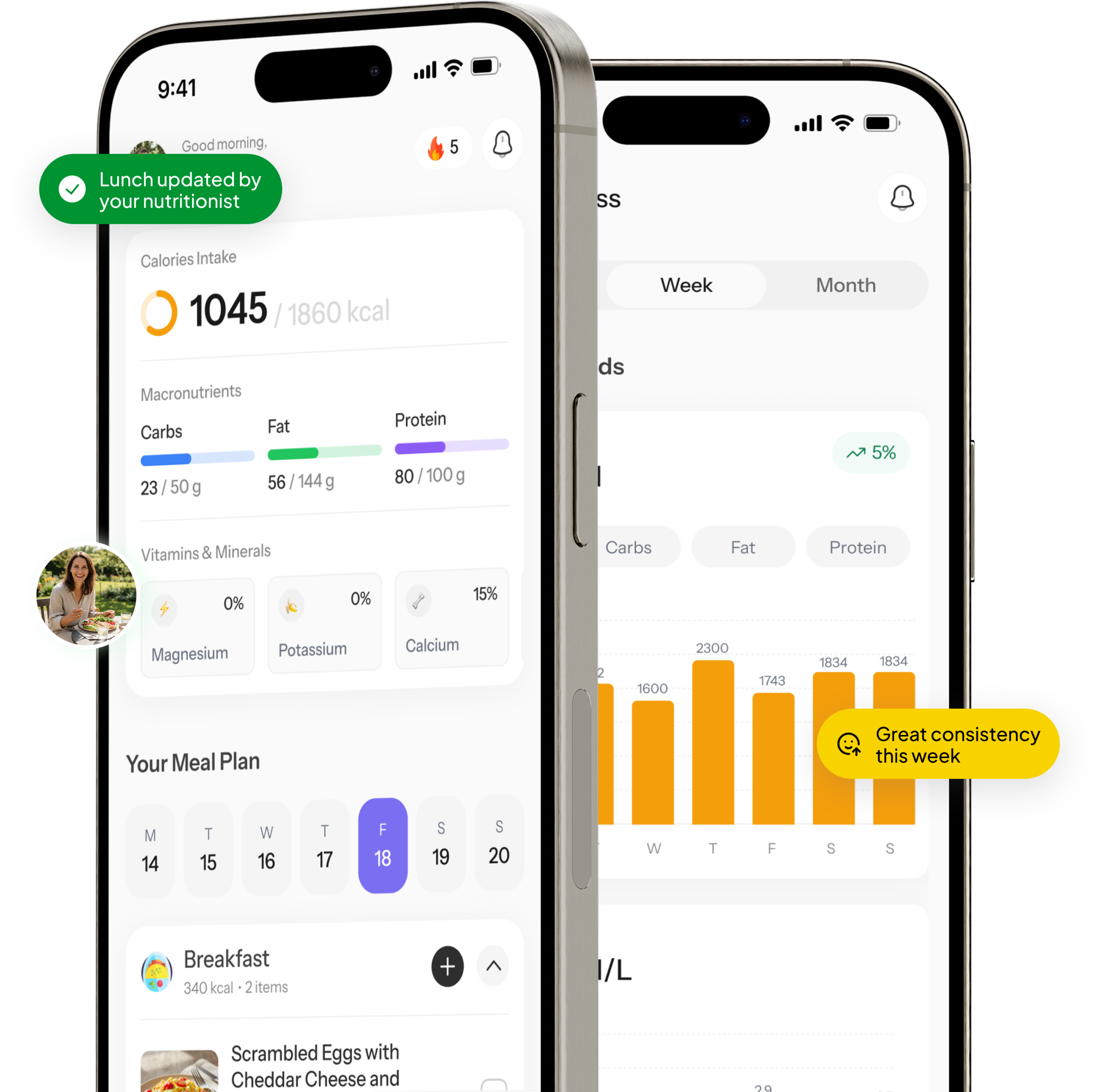 Use AI for instant, automated guidance, or opt in to work with a real nutritionist who creates and adjusts your plan based on your profile and health goals.